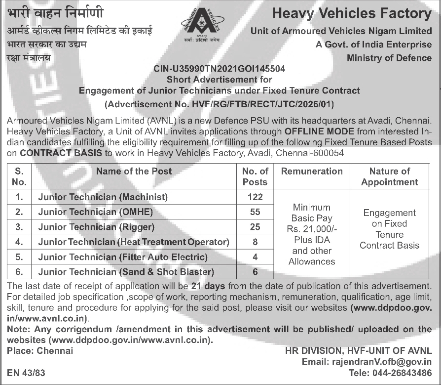 Heavy Vehicles Factory (HVF), Avadi – a unit of Armoured Vehicles Nigam Limited (AVNL) under the Ministry of Defence – has announced recruitment for 220 Junior Technician posts across various trades. The recruitment will be on a Fixed Tenure Contract basis. Candidates holding ITI certificates in relevant trades from NCVT/SCVT recognized institutions are eligible to apply. Applications must be submitted offline and should reach the designated address on or before 13 February 2026. These positions offer a consolidated monthly remuneration starting from ₹21,000 plus IDA and other allowances. Selection will be done through shortlisting followed by a trade test/written test and document verification.