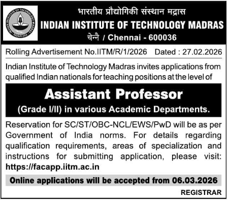 Indian Institute of Technology Madras (IIT Madras), an Institute of National Importance, has released Rolling Advertisement No. IITM/R/1/2026 inviting online applications for Assistant Professor (Grade I & Grade II) posts across multiple departments. The institute is seeking candidates with a strong record of independent, high-quality research and commitment to teaching. Eligible candidates must hold a Ph.D. with consistently good academic record. The online application process begins from 06 March 2026 and there is no fixed last date as it is a rolling advertisement.